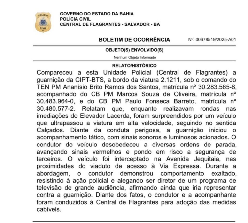 ​Durante a abordagem, o jornalista quase capotou o veículo e, já na delegacia, reagiu com chutes e pontapés contra mesas e cadeiras. A repórter que o acompanhava também precisou de atendimento após passar mal no local; chutando mesas e cadeiras. A confusão só aumentou quando a repórter, casada, apareceu completamente atribulada, gritando, descontrolada e em situação constrangedora.”